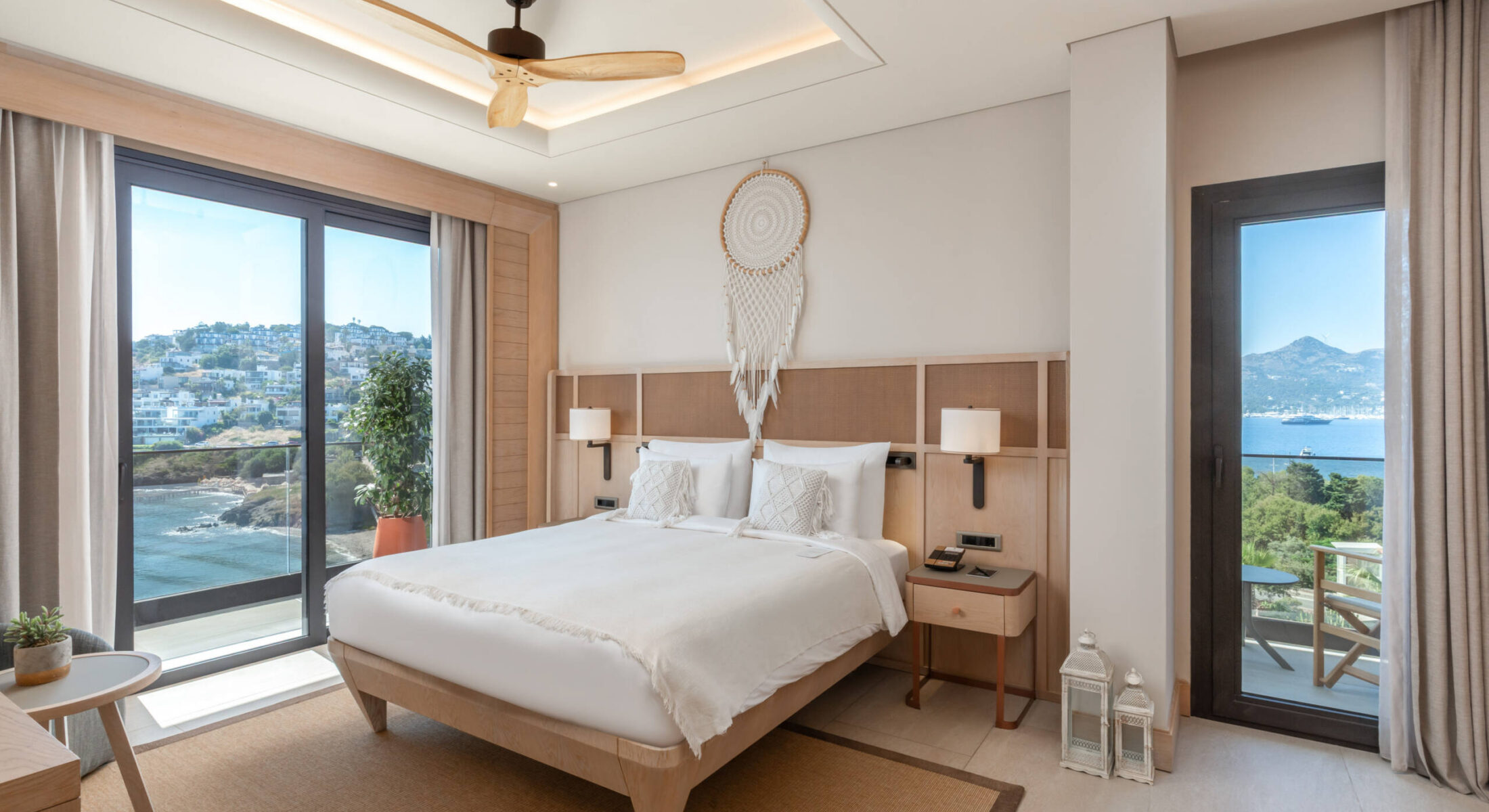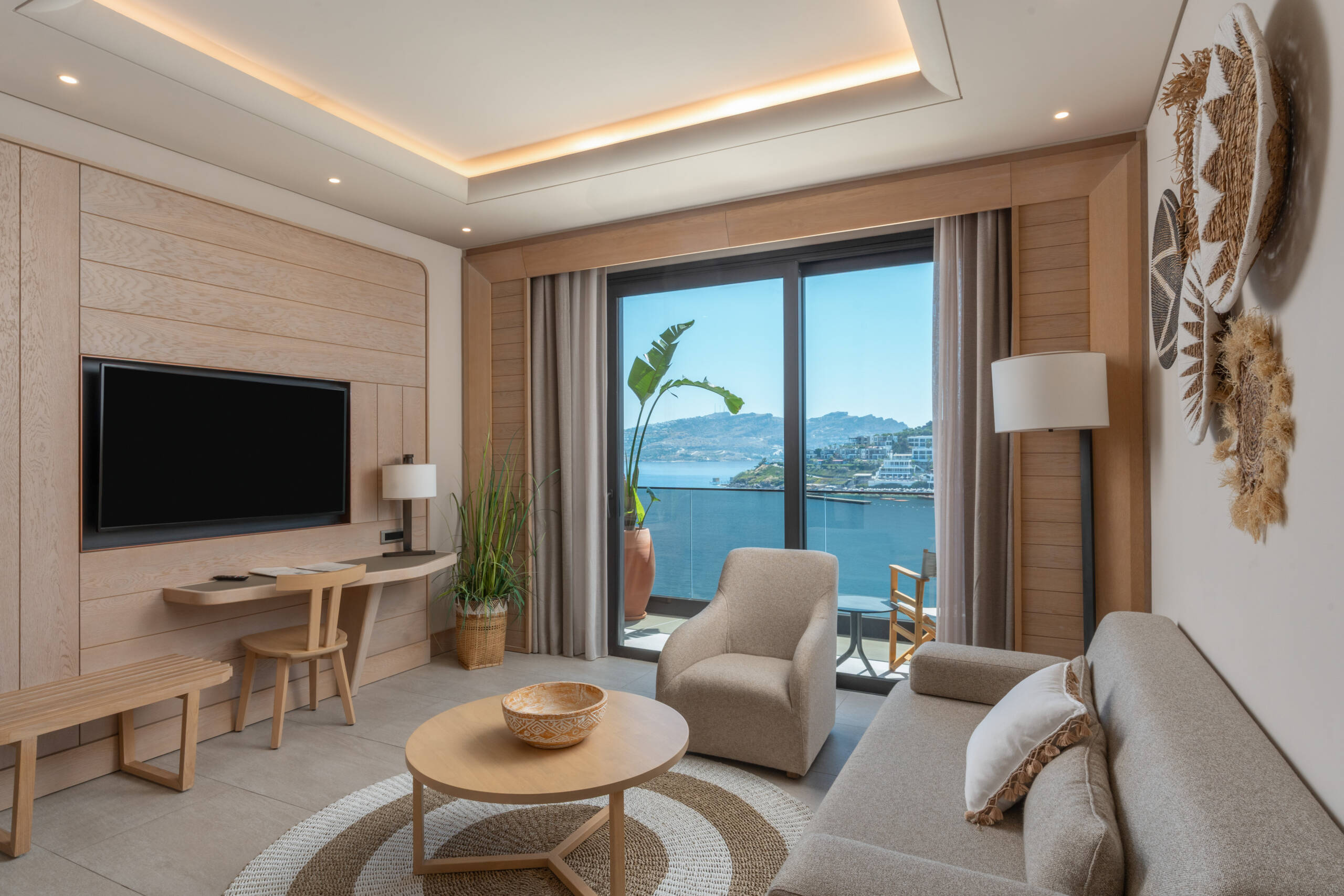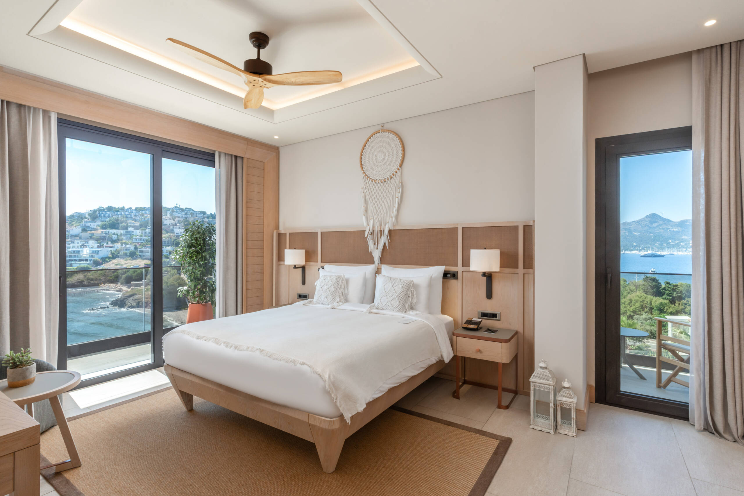 Specially designed, unique suite. Decorated in Boho Chic style. You will experience the breeze of the Aegean in our rooms designed for your comfort and enjoyment like your home. 71 square meters with balcony and sea view. 1 bedroom with king-size bed, 1 living room with a pull-out sofa and have a maximum occupancy of 3 adults and one child and 2 TV.