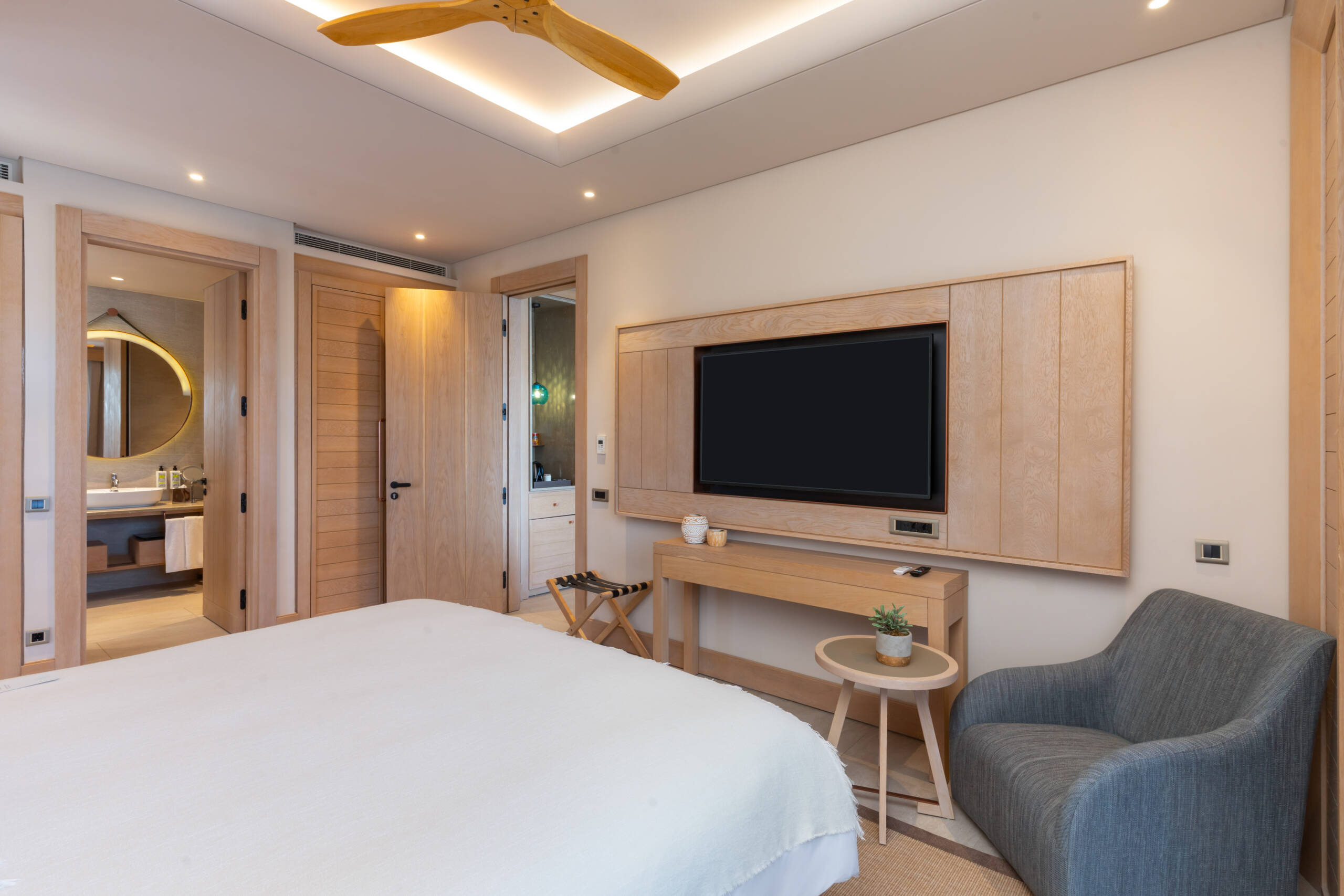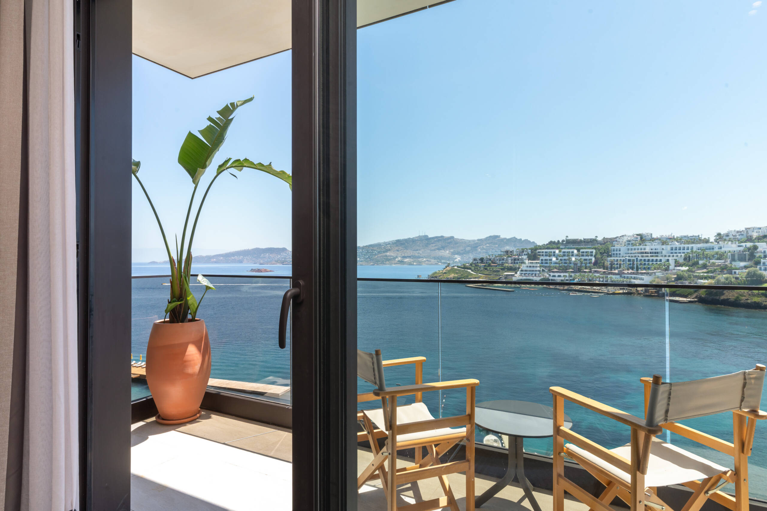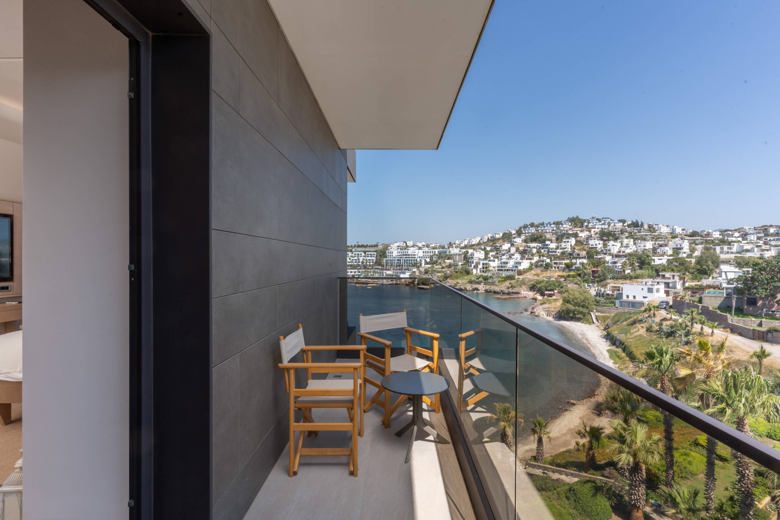 Specially designed, unique suite. Decorated in Boho Chic style. You will experience the breeze of the Aegean in our rooms designed for your comfort and enjoyment like your home. 71 square meters with balcony and sea view. 1 bedroom with king-size bed, 1 living room with a pull-out sofa and have a maximum occupancy of 3 adults and one child and 2 TV.