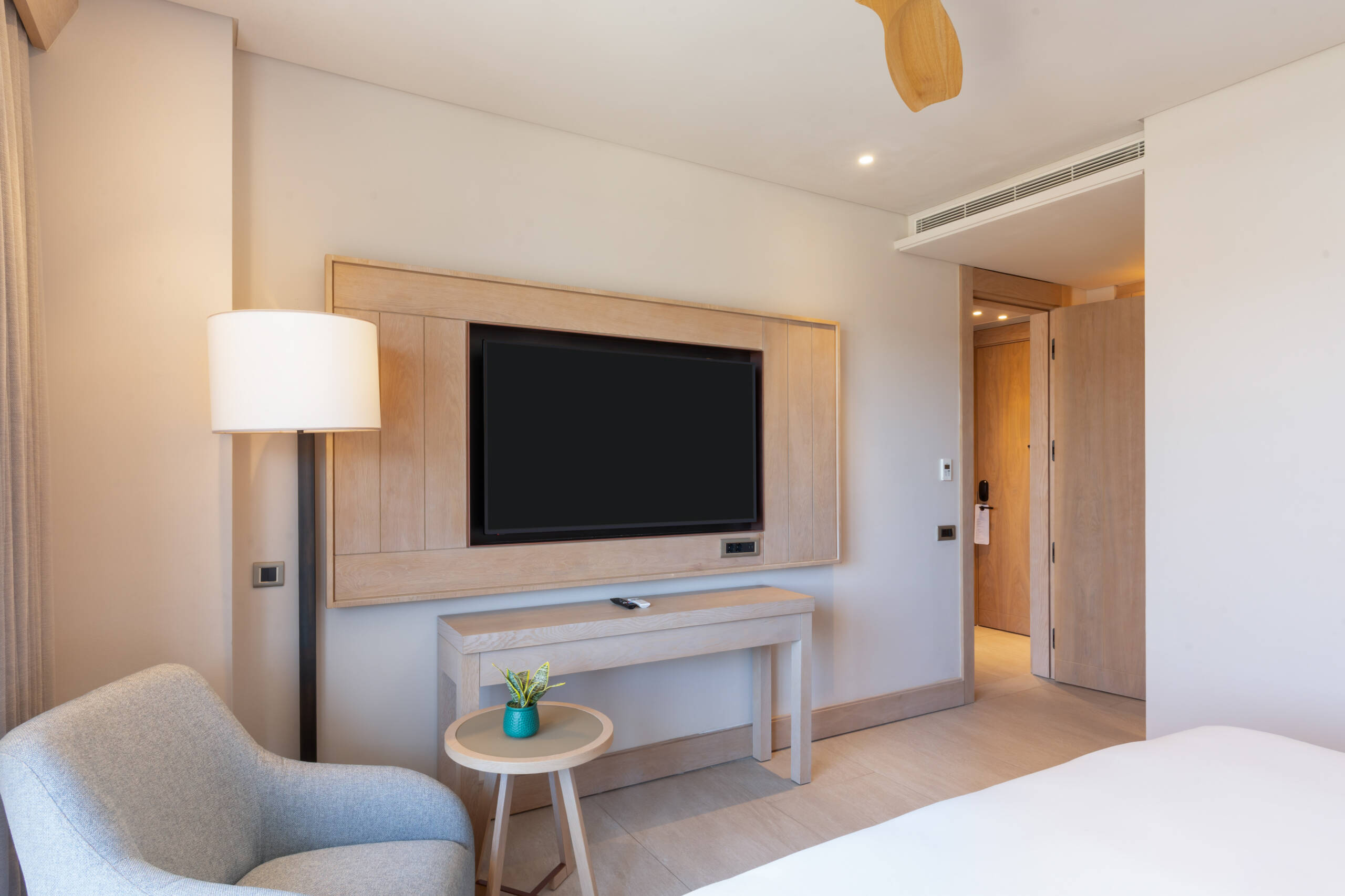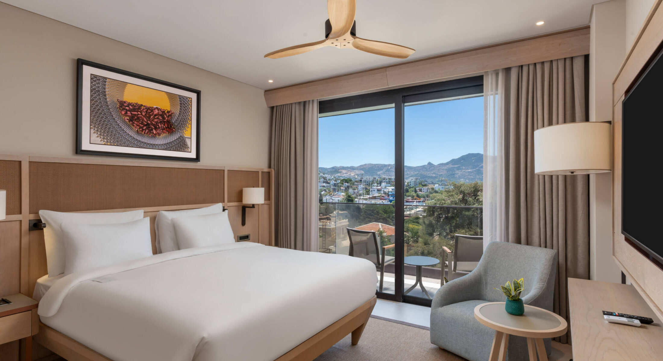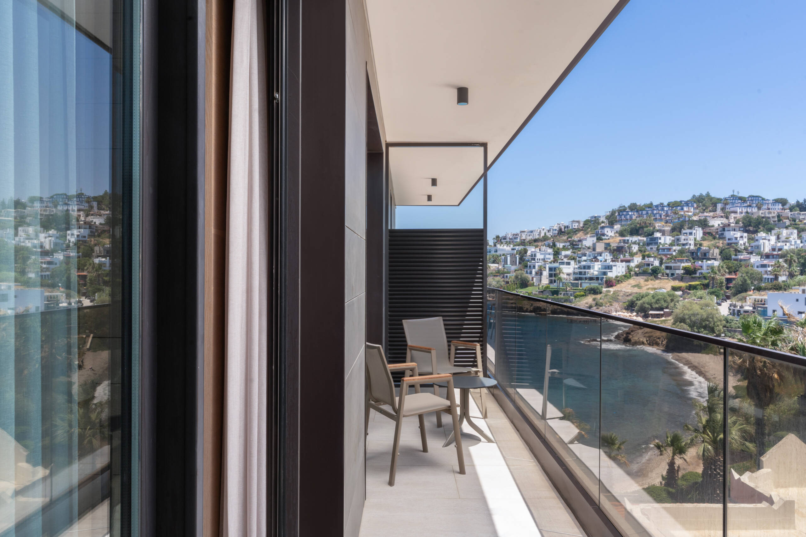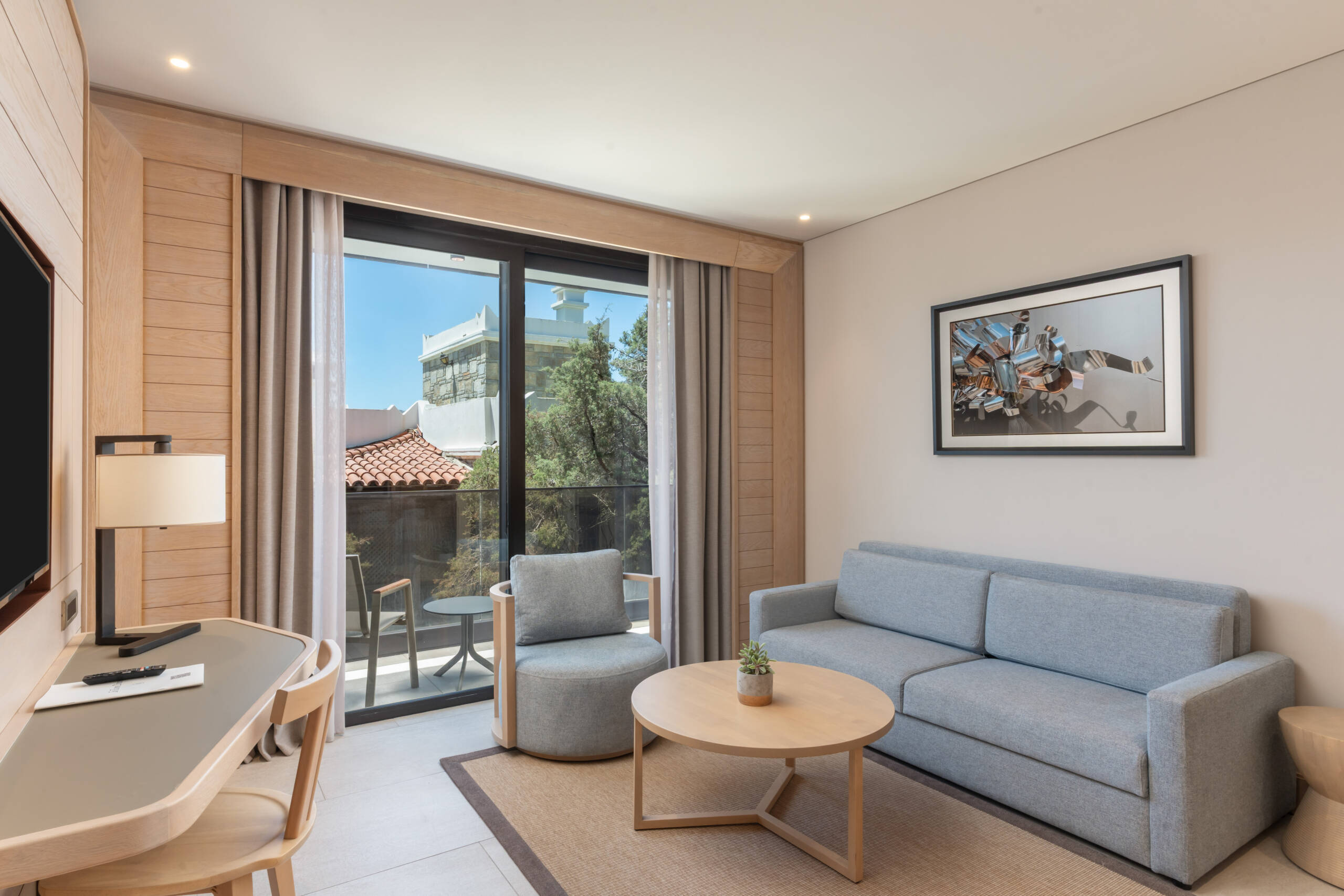 You will experience the breeze of the Aegean in our rooms designed for your comfort and enjoyment like your home. 55 square meters with balcony and land view. These suites consist of 1 bedroom with king-size bed, 1 living room with a pull-out sofa and have a maximum occupancy of 3 adults and one child and 2 TV.